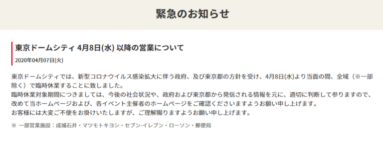 4月7日東京ドームシティでは、新型コロナウイルス感染拡大に伴う政府、及び東京都の方針を受け、4月8日(水)より当面の間、全域(※一部除く)で臨時休業することを発表、よって後楽園ホールで開催される格闘技、プロレスイベント … 続きを読む 緊急事態宣言発令により、後楽園ホール他臨時休業!無観客含む開催大会全面中止!