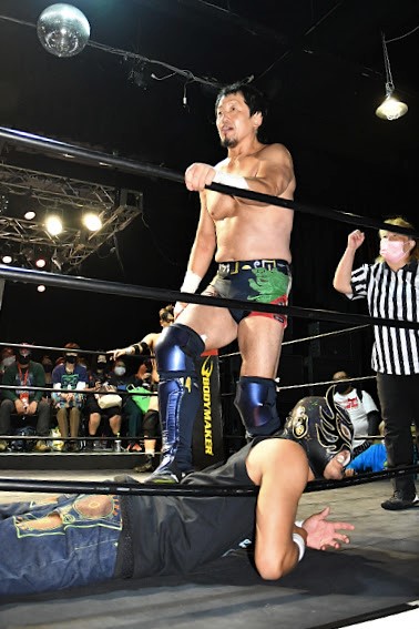 マスク着用とはいえ以前の賑わいが神戸の街、ハーバースタジオに戻ってきつつあるこの日に誕生日を迎えることが出来た喜びを訴え、それもこれもこの世に自分を産んでくれたおかんのおかげと、会場に来ていた母親をリングの上に上げ花束を贈った。