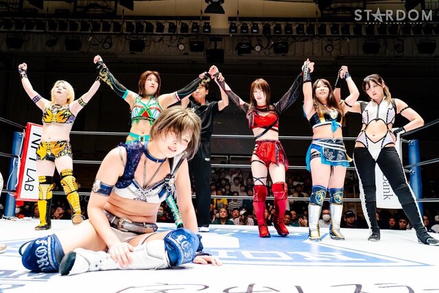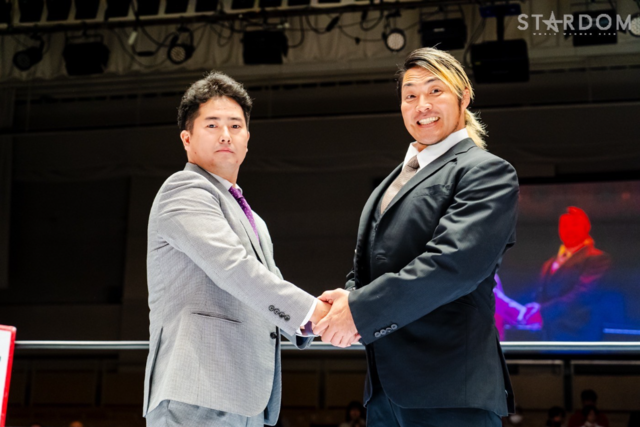 新日本プロレスの棚橋弘至社長がスターダムのリングに登場し、スターダムが新日本プロレスの完全子会社となったことを報告した。棚橋社長は「新日本プロレスがお兄ちゃんだったらスターダムが妹。家族なので力を合わせてやっていく」と述べ、新体制の意欲を示した。スターダムの岡田社長も「新日本プロレスを超える勢いで、ますます盛り上げて参ります」と力強く語り、ファンの声援を呼びかけた。