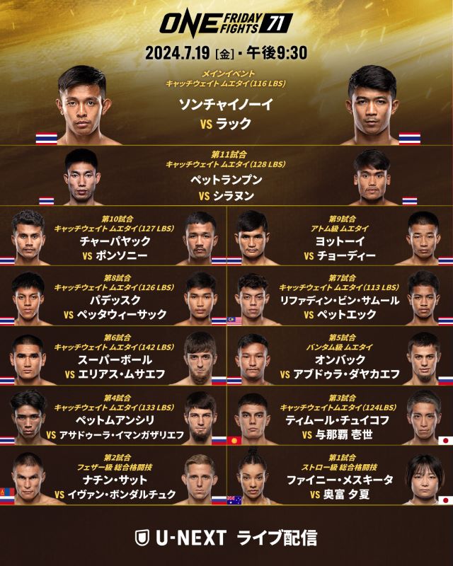 配信:U-NEXT 21:15 配信開始 / 21:30 開演予定 https://video.unext.jp/freeword?query=ONE+Friday+Fights+71&lc=LIV0000005916 〜8月18日 23:59まで視聴可