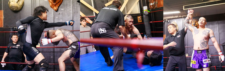 パンチで前に出る首バーコードにカウンターのストレートを合わせる三角。しかし、首バーコードは果敢に前に出る。ギロチンに捕らえるも耐え抜いた首バーコードは左右のフック。ここに三角のパンチがカウンターでヒット。後方へ倒れた首バーコードに追い打ちのパウンドを放ち勝負あり。