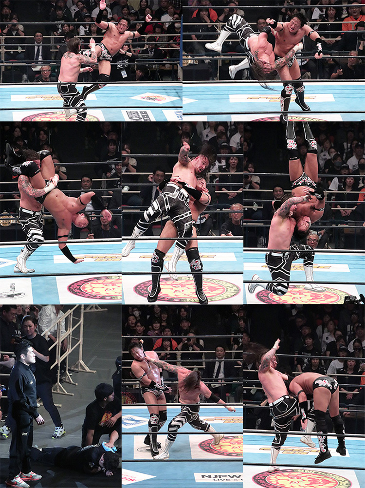 タイチは天翔十字鳳からのブラックメフィストで勝負ありかと思ったが、カウント3寸前でレフェリーの足を誰かが引っ張り妨害。その犯人は、なんとJust 5 Guysの仲間である筈のSANADAであった。ジャージを脱ぐと、BC WAR DOGSのタンクトップが現れた!