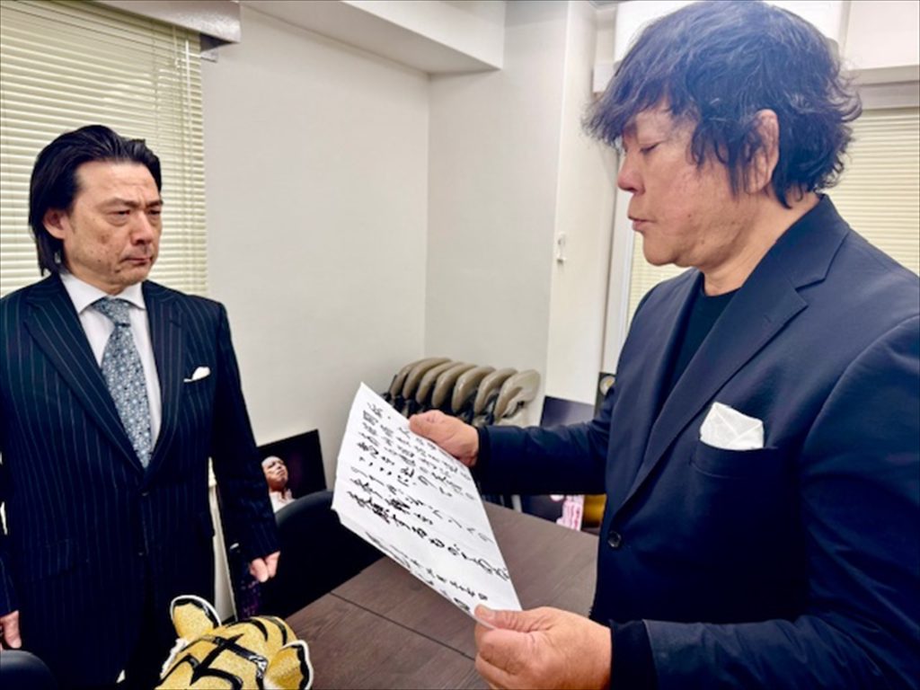 警戒した面持ちで応対した平井丈雅代表取締役を前に、大仁田はおもむろに嘆願書を広げると読み上げた。