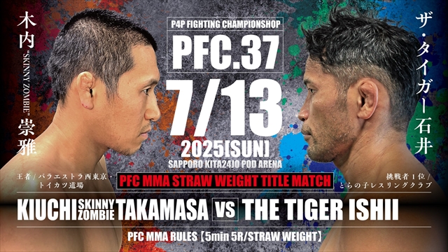 まず、前回「PFC.36」でストロー級次期挑戦者決定戦を制したザ・タイガー石井(とらの子レスリングクラブ)が、王者・木内“SKINNY ZOMBIE”崇雅(パラエストラ西東京・トイカツ道場)の持つストロー級タイトルに挑戦する。木内にとっては初の防衛戦となる。