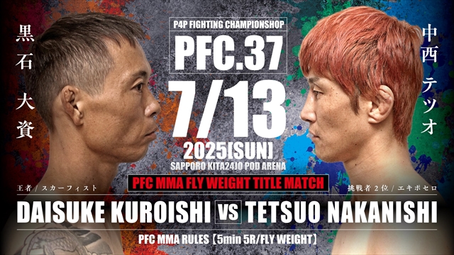 また、フライ級タイトルマッチでは、黒石大資(スカーフィスト)と中西テツオ(エキポセロ)の再戦が実現。「PFC.35」において中西は、平井総一郎(リバーサルジム武蔵小杉所プラス)を1ラウンドで瞬殺し、2度目のタイトル挑戦の座を掴んだ。王者・黒石にとっては、これが2度目の防衛戦となる。