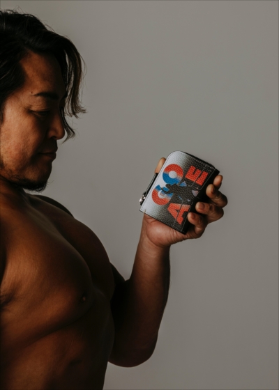 表面には、棚橋弘至選手の象徴的なポーズに、同選手のキャッチコピーを添えてトリコロールでデザイン。背面には、エアギターを奏でる棚橋弘至選手のシルエットのグラフィックをプリントしました。素材は、型押しした「プリントシュリンクレザー」を使用して奥行きのある表情で仕立て、特徴的なデザインを引き立たせるために、ファスナーや金具にはシルバー色を採用。小銭入れには、棚橋弘至選手の名言にちなんだ「NEVER TIRED」と、新日本プロレスのトレードマークである”ライオンマーク”を刻印しています。