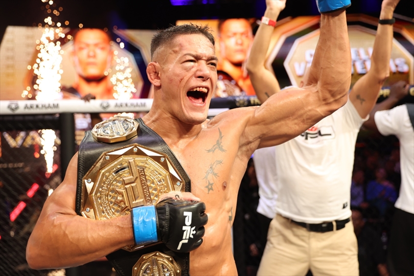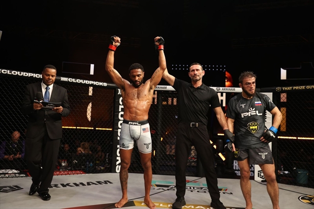 “ザ・スパニヤード” コステロ・ヴァン・スティーニス(17勝3敗)は、前王者ジョニー・“プレッシャー”・エブレン(16勝1敗)を、試合残り数秒の時点でリアネイキッドチョークで失神させるという、MMA史上でも屈指の逆転勝利を達成し、新たなPFLミドル級世界王者に輝いた。エブレンは5ラウンドを通して優勢に試合を進め、判定勝利が濃厚と思われていたが、ヴァン・スティーニスは最後の最後で背後を奪い、一本勝ちをもぎ取った。