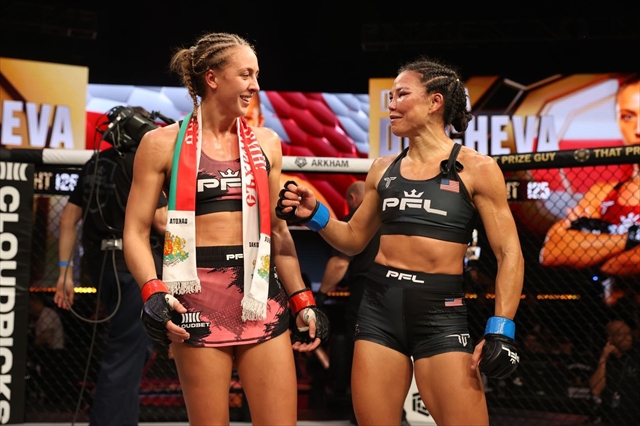 2024年PFL女子フライ級王者、“デンジャラス” ダコタ・ディチェヴァ(15勝無敗/英国)は、アメリカのスミコ・“レディ・サムライ”・イナバ(8勝2敗)を打撃で圧倒し、判定勝利を収めた。ムエタイをベースとした打撃は終始炸裂し、パンチ、キック、ヒザ、ヒジ、クリンチで優位を保った。イナバは最後まで果敢に攻めたが、ディチェヴァの強さが際立つ内容だった。