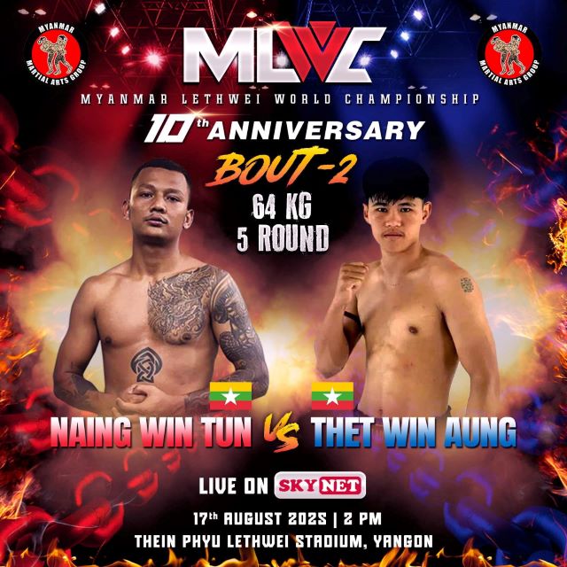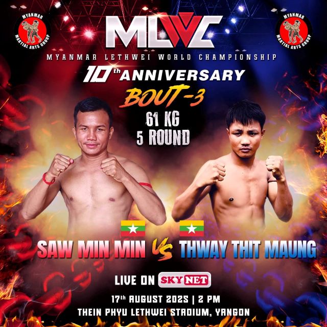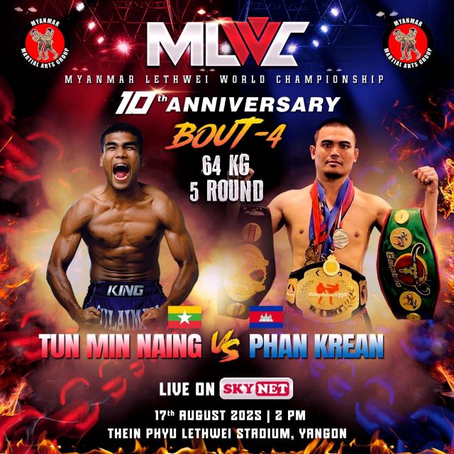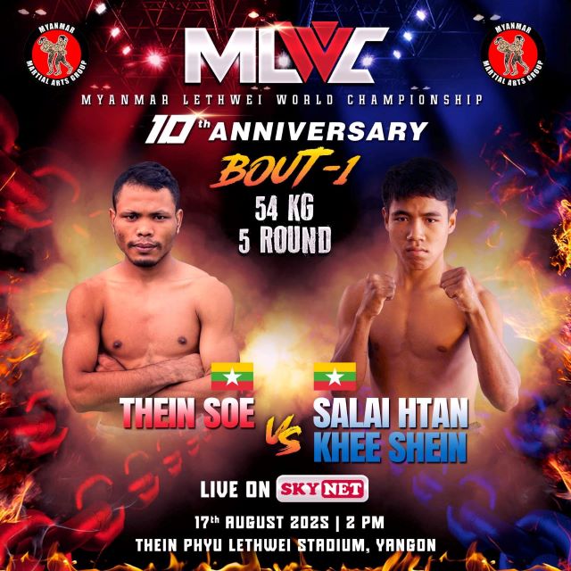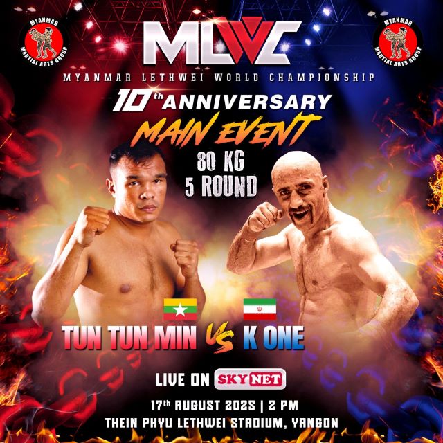 8月17日(日)ミャンマー・ヤンゴンのテンピューボクシング・スタジアムでラウェイ世界大会MLWC(ミャンマー・ラウェイ・世界選手権大会)の10回目大会が開始される。現在ミャンマーでラウェイは低迷しており、ヤンゴンでのビッグマッチも久々となる。メインは元ラウェイ王者で日本大会にも参戦経験あるトゥン・トゥン・ミン(ミャンマー)がタイを拠点に活動するケイワン・ソルマーニ(イラン)と対戦する。両者は2020年1月20日『ဝင်းစိန်တောရ(WIN SEIN TAW YA)Challenge Fights』で対戦して5R時間切れ引分。ケイワンはシュー・ヤーマン(2019年1月30日)、ソー・ゴー・ムード(2018年1月31日)のラウェイ強豪選手と対戦しており引分ており、BKFC(Bare Knuckle Fighting Championship)でも無敗、ONEタイ定期大会第1回にも参戦(2023年1月20日「ONE FRIDAY FIGHTS 1」)してムエタイ、キックで100戦以上の戦績を誇るベテラン選手である。