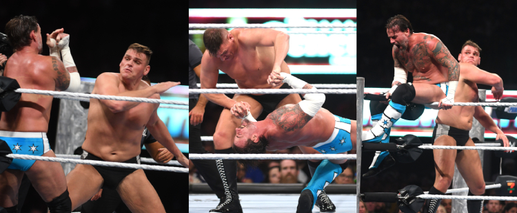 しかし、そこが初日のフィーナーレではなかったのだ。本誌既報の通り、セス・ロリンズの怪我は三味線だったようで、いったんバックステージに戻ってクラッチを外してリングに戻ってくる。再びGTSを見舞おうとするパンクに、まずはブリーフケースでブン殴った。
