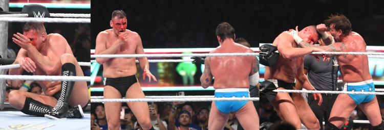 実況席に投げつけられたグンサーは流血。CMパンクは鮮血に染まった頭を狙っていく。