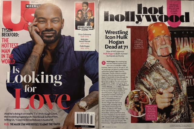 オフレコ TVだけやない。週刊誌のUS Weeklyも、表紙こそ恐らく前から入稿済み、決定済みのモデルだけど、右上にオジー・オズボーン、ハルクの相次ぐ訃報を入れて、中にも特集記事や。