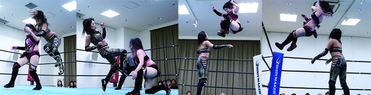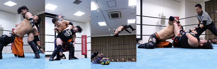 その後も、勝村が2人まとめての攻撃や、清水のスリーパー、一のバックドロップ、水野のサイドスープレックスなど、それぞれが大技を炸裂。