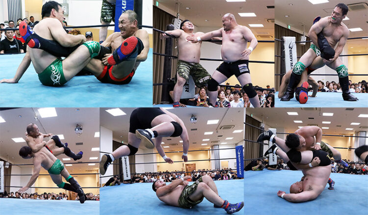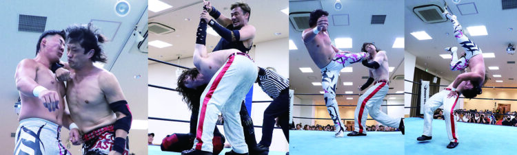 序盤はロックアップから腕の取り合い、グランドと教科書通りの動きから、中盤は大技の攻防、岡田剛史が変形のストレッチを出せば、ドングリー藤江はフランケンシュタイナー、そしてエルボー合戦から藤江がコブラツイスト、低空ドロップキック、DDT、その場飛びムーンサルトを決める。しかし、岡田もネックブリーカーからスープレックスを決めるも決定打にはならず。