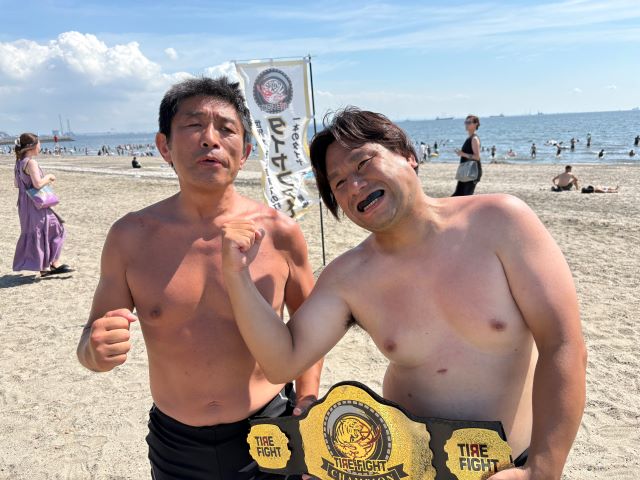 タイヤファイト千葉大会が、東京から一番近い千葉の海、いなげの浜で強行開催された。いなげの浜とは稲毛海浜公園に隣接する海岸で、同じ公園内にある稲毛海浜プールは市民からの通称『いなプー』からも自由に出入り可能。若者にも人気のスポットだ。ここでタイヤファイトの千葉タイトルマッチが行われる。千葉のベルトは県民カラーの黄色がベースだ。