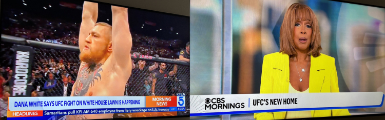 上記3大ネットワークは全部が取り上げた。4大ネットワークのFOXだけ夜の”トランプ広報本部ニュース”(笑)に全力投球なので、朝のニュース番組は短いらしいが、系列のThe CE networksが、かのホワイトハウスでのUFC開催とかをやった。