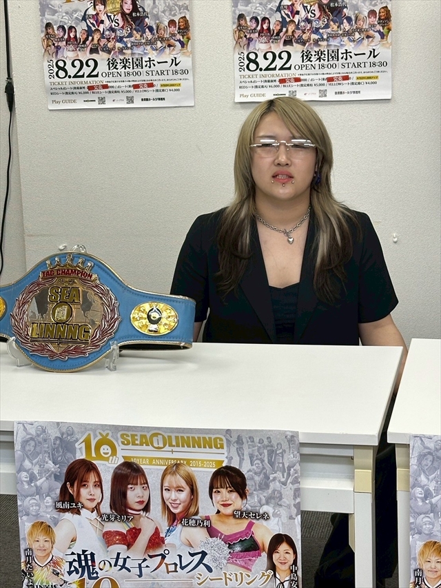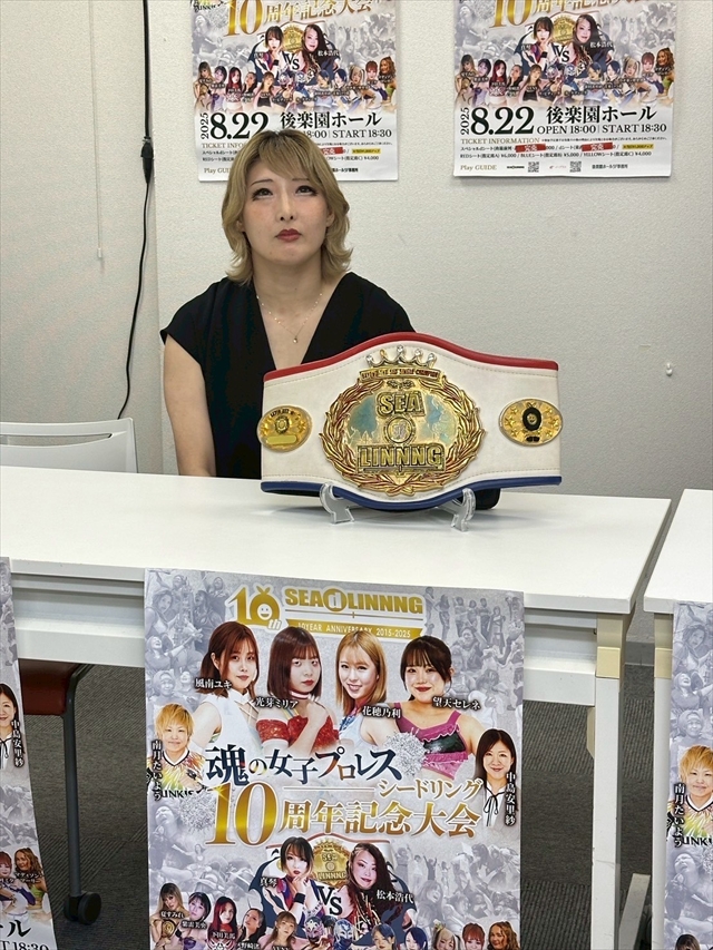 水波「ビヨンド・ザ・シー第6代チャンピオン・水波綾でございます。シードリング10周年おめでとうございま~す。記念すべき10周年の興行に参戦できて、とてもとても嬉しいです! シングルチャンピオンが勢ぞろいする8人タッグマッチは、今の女子プロレスもそうですが、シードリングの歴史を感じることのできる試合じゃないかと思いますので、熱い闘いになると思いま~す! 夏の最高の思い出を作りましょう!」