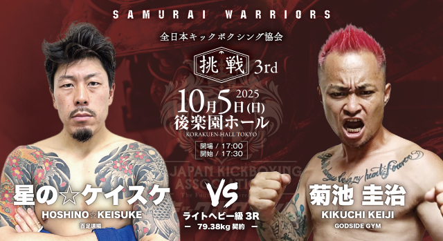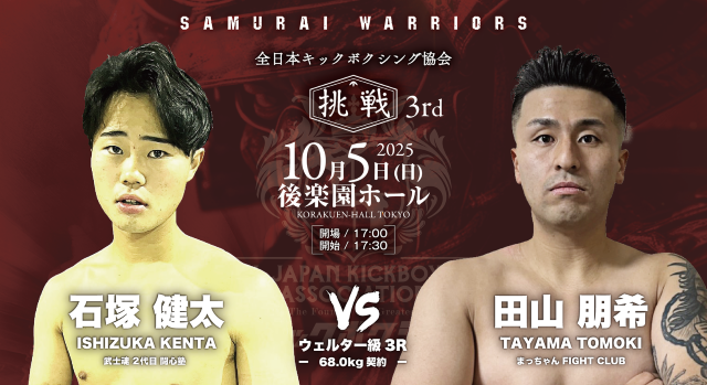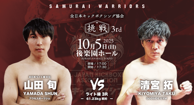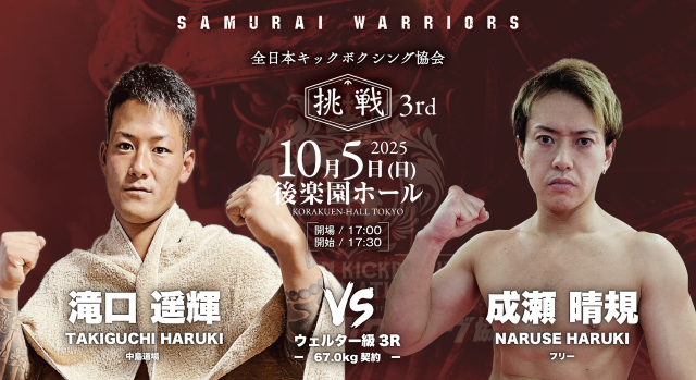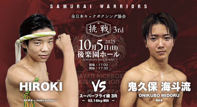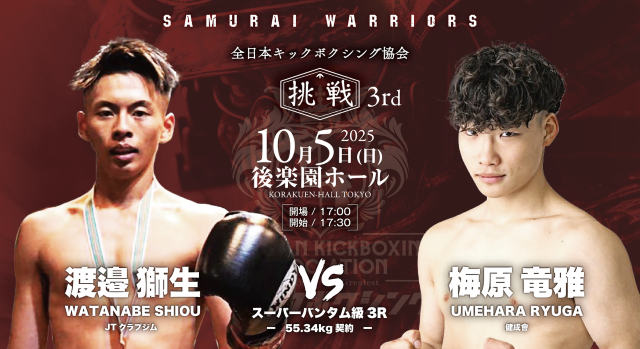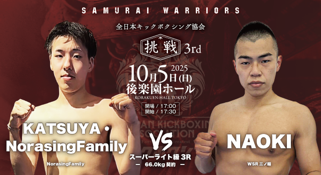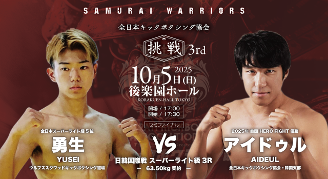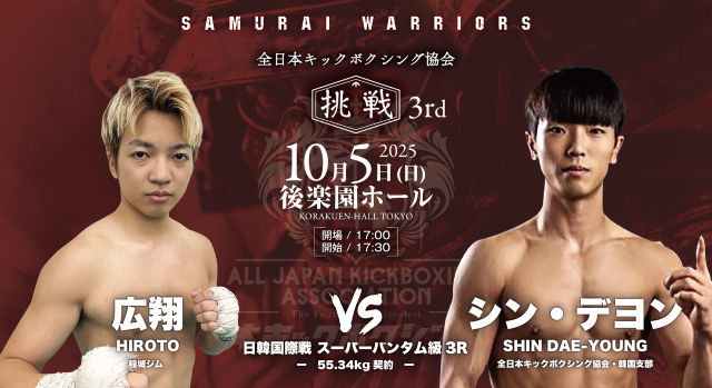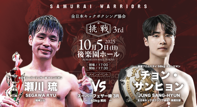 10月5日(日)、東京・後楽園ホールで開催される『全日本キックボクシング協会“SAMURAI WARRIORS 挑戦 3rd”』。肘・膝・首相撲有効の3R・5Rで行われる純・キックボクシングルール(公式ルール)で行われる大会のメインは、日韓対抗5対5で王者・瀬川琉 vs. 韓国プロムエタイ55㎏王者チョン・サンヒョンだ。さらに無敗の野竹兄弟、広翔、義斗の全日本キックボクシング協会期待の4選手が韓国選手と対戦する5対5が注目になる。次世代を担う選手が出場する全13試合がマッチメイクされた。
