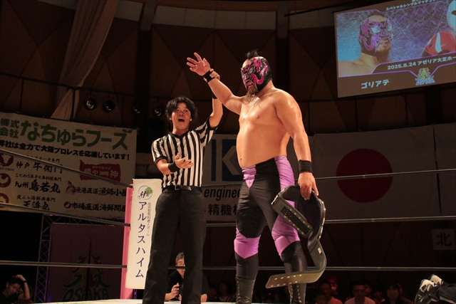 ※タコスパに引きずられて嫌々入場した丈一郎が観客のコールに奮起してゴリアテに襲いかかるもカウンターのラリアットが決まり秒殺勝利。