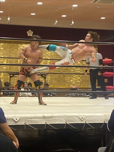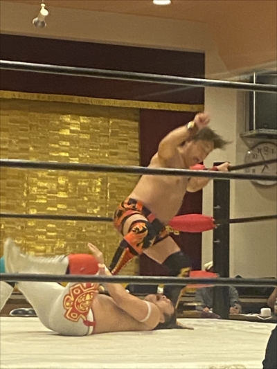 エルボと水平チョップの打ち合いから、晴斗希がブレーンバスターを狙うも、守屋が返す。