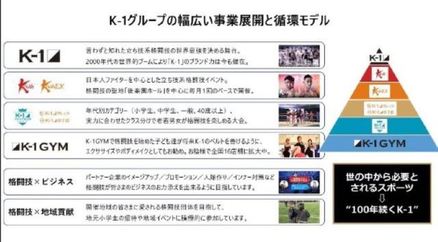K-1の最大の特徴であり、強みであるのは、「観戦スポーツ」と「参加型スポーツ」という、両軸が相互に作用し、永続的な発展を生み出す独自の循環モデルです。