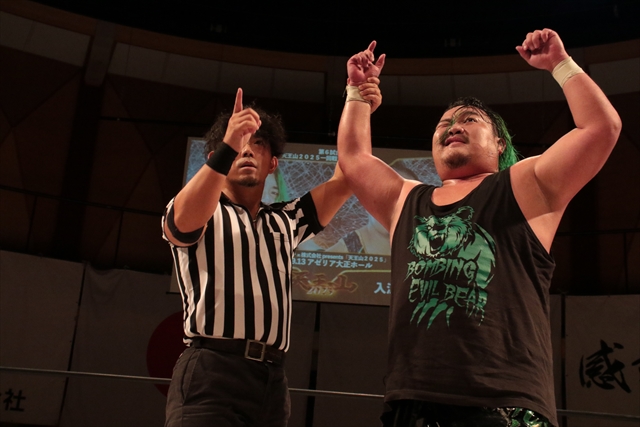 次第に両者の息遣いが荒くなる大技合戦の消耗戦になり意地のエルボー合戦へ。ビーストボンバーとメガトンラリアットの打ち合いから入江のバックエルボーで両者ダウン。