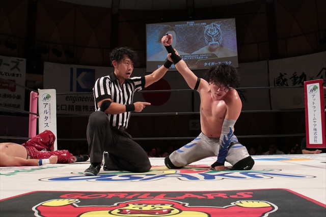 ※息をするのも忘れるような緊迫感の中、両者の一挙手一投足に注目が集まる。タイガースがインサイドワークを狙って場外へ出たところ、松房がこれを読んで場外戦が開始。タイガースが場外ブレーンバスターを決めて、松房に場外弾を浴びせようとコーナートップに登ったところ、松房が飛び膝を決めてタイガースは3m下の場外に吹き飛ぶ。これをチャンスと見た松房が我龍天睛を決め畳み掛けようとするも、タイガースのドロップキック一閃から凄まじい蹴りで反撃。コーナートップでの応酬を制した松房がラストライドを決めると、タイガースはデルフィンスペシャルでやり返す。凄まじい攻防の末、松房が新技でタイガースを絞め落として勝利。