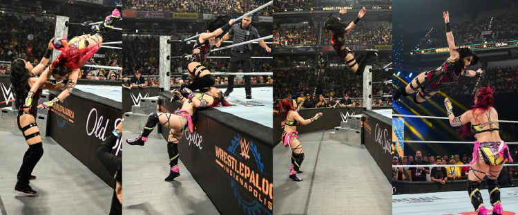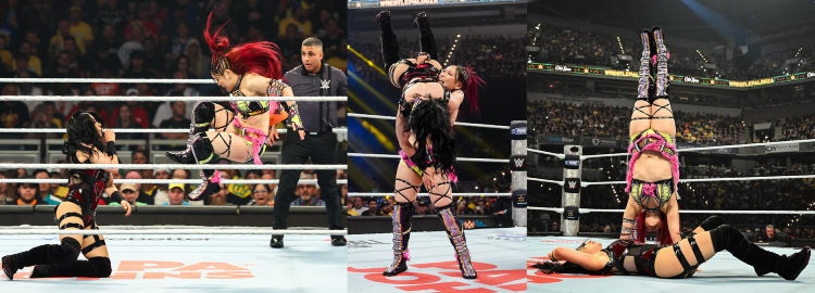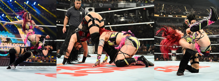 最後、勝機と踏んだイヨがスパニッシュフライを決めてからニーパッドを外してコーナーに追い詰めたステファニーに膝蹴り。さらに後頭部にも見舞い、そこからコーナートップに登ってのムーンサルトへ。ここからのシークエンスがWWE公式写真に抜けているのだが、これが失敗ということは、イヨはむき出しの膝を打ち付けてしまうことに。そこから膝を痛がるセールのイヨに、今度は正面左側のコーナーからステファニーがスカイツイスターを決めた。