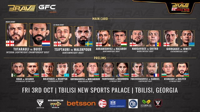 メインイベントは、BRAVE CF暫定ライト級世界王座決定戦。ジョージア出身でランキング1位の挑戦者ラウリ・トゥタラウリが、オランダの強豪ピエター “ジ・アークエンジェル” ブイストと対戦し、母国の地で栄光を掴むべく挑む。歴史的な夜を彩る大一番となる。