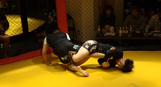 渡部修斗が火を付けたプログラップリング戦に二人の猛者が手を上げた!互いに岩手と九州でジムを持つ代表、長である。しかも、年齢も同じ。柔術の帯では岩手の大高が紫帯、九州の池田が黒帯である。池田はQUINTET九州大会の代表選手でもあり、下馬評では大高が不利との予想が大方。大高はMMAファイターであるが、今回初のグラップリグ戦への挑戦であった。試合は開始早々下になる池田、動き方がザ・柔術家らしい動きで、下から引き込もうとするも大高はそれを上から冷静に対処し引き込まれず、ペースを握らせない。引き込めないと見た池田、今度は自ら上に成ろうと展開を変える。その時を見計らったかのように大高が あれよ あれよと池田の足を捕獲しヒールフックで捉え池田はタップ、勝負有り!勝った大高のマイクではプランには無かったが日頃やってた動きが自然に出たとコメント。負けた池田はあの展開は一番苦手な展開とコメント。セミファイナルに抜擢された注目のグラップリング戦は、紫帯大高が黒帯の池田を倒し、思いも寄らない短期決戦の結末となった!!プログラップリング戦は、今後益々盛り上がりそうな気配だ。