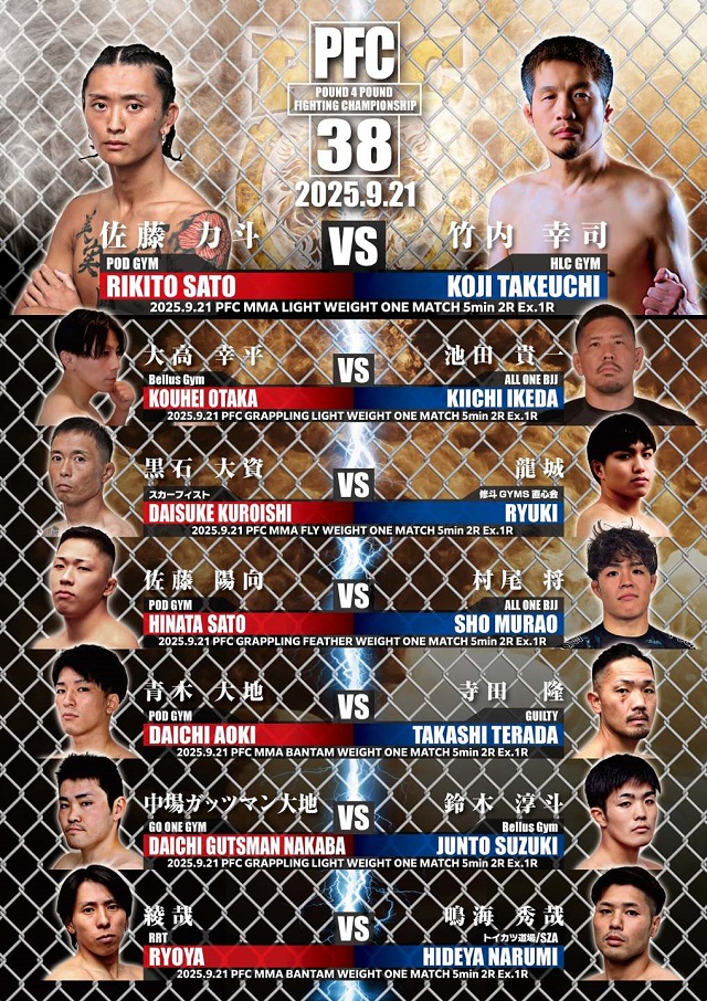 大会は、新たなPFCの風と成ったプログラップリング戦、至極の3戦が行われ、MMA、GRAPPLINGと交互に行う新しい興行スタイルで行われた。衝撃的なKO一本のフィニッシュラッシュで、全7試合中6試合がフィニッシュ決着という来場者もビックリの蓋を開けて見れば神興行、劇的で波乱の大会となった!!
