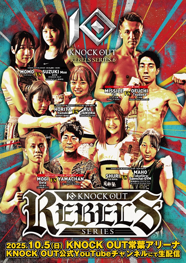 10月5日(日)KNOCK OUT常葉アリーナで開催された「KNOCK OUT REBELS SERIES.6」。肘・首相撲有効のREDルールに旧K-1ルールのBLACK 4試合(第1試合中止)が行われた。メインは群馬県から参戦の茂木豪汰(上州松井ジム)がKO勝ちで、6月22日THE KNOCK OUT、8月29日(タイ現地時間)Rode To RWS タイ・バンコクでの連敗から復活した。また兵庫県から参戦した堀田優月と珠璃のNJKFミネルヴァ女子王者も判定で勝利した。