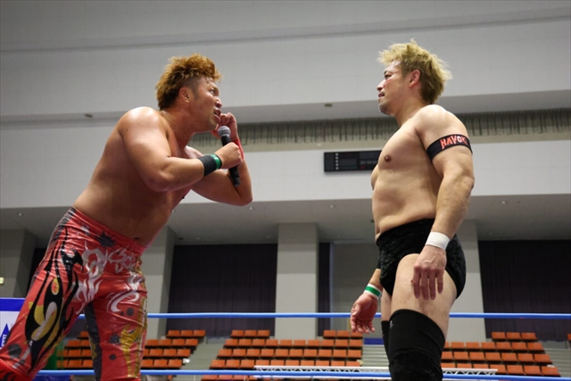 場外戦に移行するとザイオンがエプロンからのサモアンドロップで安齊を叩きつけ、オデッセイもロープ際でのボディプレスを見舞うなど、HAVOCらしい豪快な攻撃が続く。なんとかミサイルキックで脱出した安齊が優馬にタッチすると、優馬はザイオンにボディアタック、オデッセイにはドロップキックを浴びせて反撃の狼煙を上げる。ザイオンをコーナーへ送り込んで連携攻撃を仕掛け、チームとしての完成度を見せようと試みるも、直後にオデッセイのパワーで流れを断ち切られ、逆に劣勢を強いられる。
