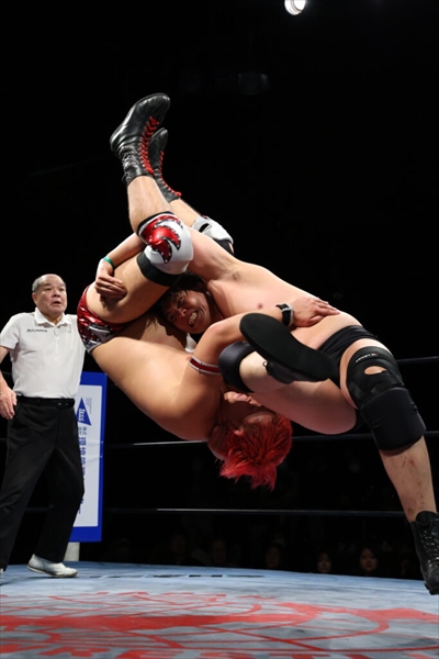 開始前からすでに火花が散っていたのは、やはり宮原と潮﨑の因縁があるからに他ならない。ゴング前にいきなり宮原が潮﨑へ蹴りを見舞い場外乱闘を引き起こすと、その後も潮﨑がリングインしようとするたびにキックで突き落とし、怒りを全面に出したファイトを展開した。10年前、ユニット「Xceed」の一員として世界タッグ王座を共に戴冠した二人だが、当時突然の潮﨑の退団によりベルトは返上されることとなり、宮原にとってはそれが大きなトラウマとして残っている。試合中、そしてマイクアピールでも繰り返された「出たり入ったり、ベルトを返上したり」というフレーズは、そんな10年越しの怨念の結晶である。
