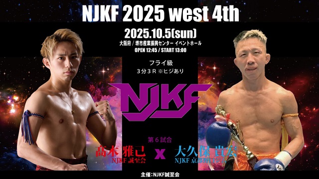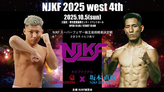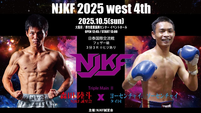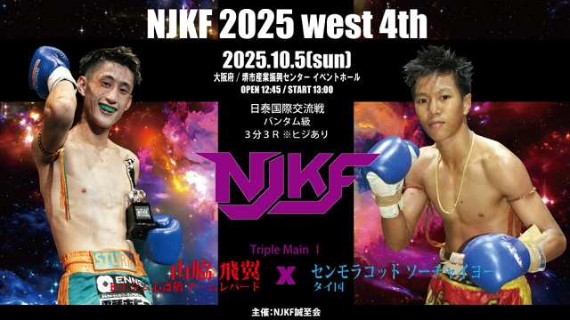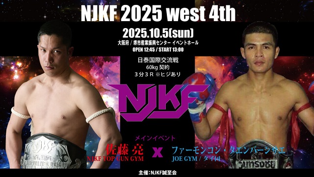 10月5日(日)大阪・堺市産業振興センターで開催された「NJKF 2025 west 4th」。メインの日泰3対3対抗戦は、大将・NJKF スーパーフェザー級王者 佐藤亮 (NJKF 健心塾)が、ラジャダムナン&ルンピニーランカーでワンソンチャイ王者のファーモンコンの肘でKO敗けとなったが、K-1グループながら肘・首相撲有効のキックにも参戦する山脇飛翼/つばさ とNJKFランカーの森田陸斗がKO勝で対抗戦を勝ち越した。