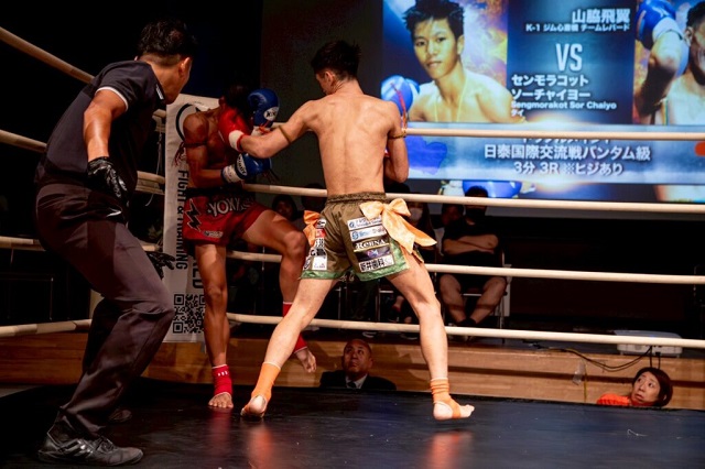 日泰国際交流戦、先鋒は K-1選手の中でもムエタイ志向の強い 山脇飛翼が1R 開始早々後ろ回し蹴りで流れをつかみ、センモラコットのミドルキックをキャッチしてのストレートやローキックで着実にダメージを与えていく。2R 山脇のカーフに対しセンモラコットは首相撲で対抗し鋭いヒジを繰り出すも決定打にはならず。3R に入ると山脇がストレート、ジャブを入れ序盤より攻めの姿勢。ワンツーからのボディを交えたラッシュでセンモラコットをコーナーに追い込み更にラッシュをかけ KO 勝利となった。