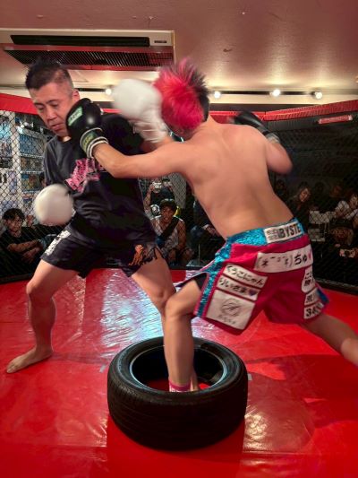 その阿久津に続く軽量の藤井は2025年那覇市議選出馬の根性で有権者にアピールすることができるのか? 阿久津がサウスポーの為、コイントス。オーソからのスタート。試合開始早々、高校生阿久津の左フック連打がヒット。尻もちをつく藤井。タイヤアウトかと思われたがそのまま立ち上がることは出来ず。レフリーが阿久津のKO勝ちを宣言した。