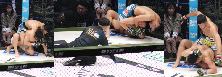 木村のアッパーを一発被弾したもののタックルからのテイクダウンに成功してグラウンドで木村を圧倒した。しかし木村も粘り1Rは時間切れで極めきれなかった。