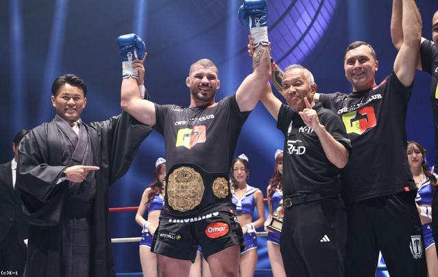 11月15日(日)東京・代々木第一体育館で開催された「K-1 WORLD GP MAX 2025~-70kg世界最強決定トーナメント」。8選手によるワンデートーナメントは191㎝と長身のジョナス・サルシチャ(ブラジル/TF Team/CT Allan Popeye)が長いリーチを活かしてのパンチ、蹴り、膝蹴りを有効に使い、初戦で中国の優勝候補でもあった強豪オウヤン・フェンにダウンこそ奪えなかったが完勝、準決勝ではリザーバーのジョナサン・アイウルをパンチで2度ダウンを奪う秒殺。決勝戦もパンチ、前蹴りで攻め、一方的な展開で顔面も腫れ、ボディも効いてるダリル・フェルドンクのボディに左前蹴りで2度倒し、圧倒的な強さで優勝した。