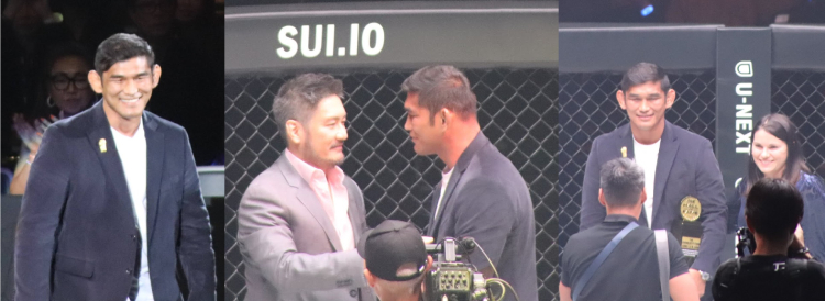 今回行われた4タイトルマッチ。左手側から日本人初のONEムエタイ新王者となった吉成名高、キック統一王者となったスーパーボン、チャトリCEO、MMA王座防衛成功の若松佑弥、クリスチャン・リー