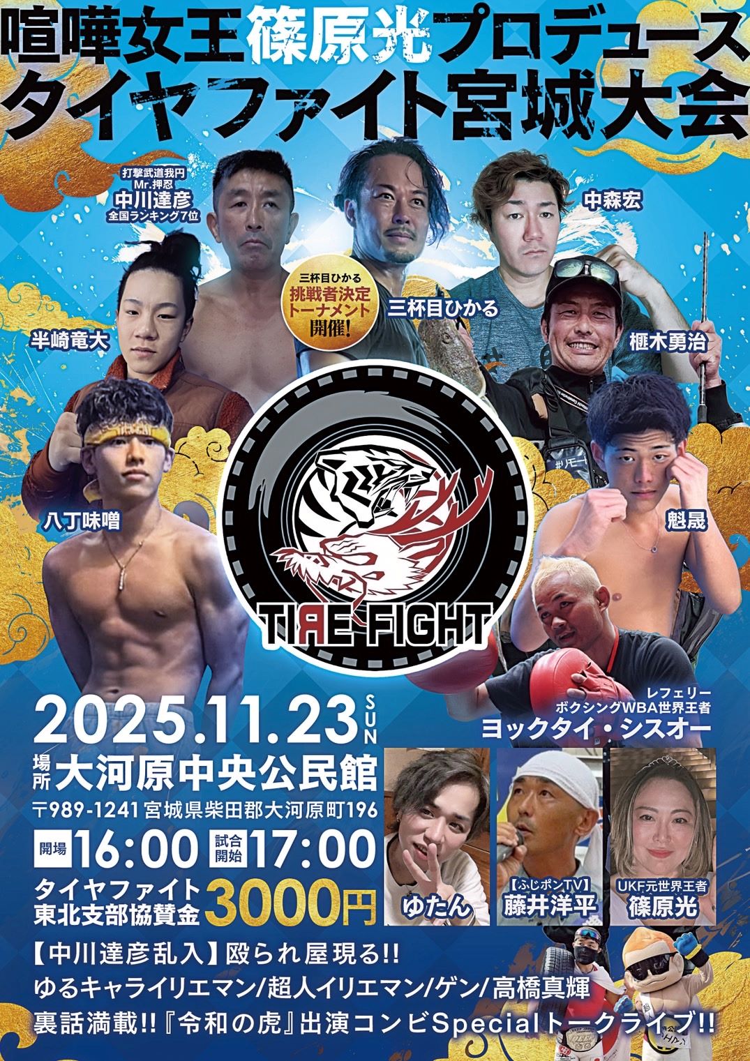 世界1近い距離の打撃戦と言われるタイヤファイトの東北地区初進出が11月23日、宮城県柴田郡にある大河原中央公民館で開催され、本大会プロデューサーの篠原光も大興奮の激闘の連続で東北地区タイヤファイトは熱狂に包まれた。過酷なトーナメント戦を制したのは、極真空手全国準優勝の実績を持ち、王者三杯目ひかる同様配信者でもあるゲンだ。