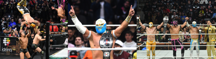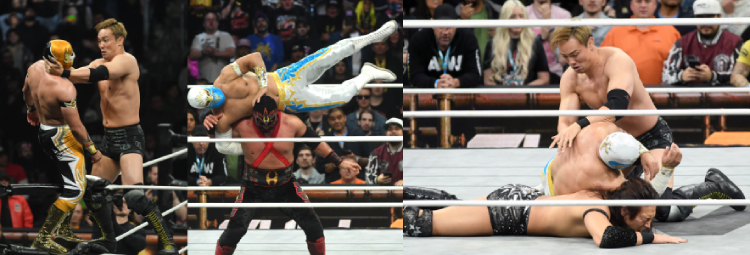 ―― ただ、せっかく自前写真確保しているんだし、オカダ・カズチカ&竹下幸之介&エチセロのドン・キャリス・ファミリーが、マスカラ・ドラダ&ミスティコ&ネオンが保持するCMLL世界トリオ選手権に挑戦するカードは紹介しないといけません。