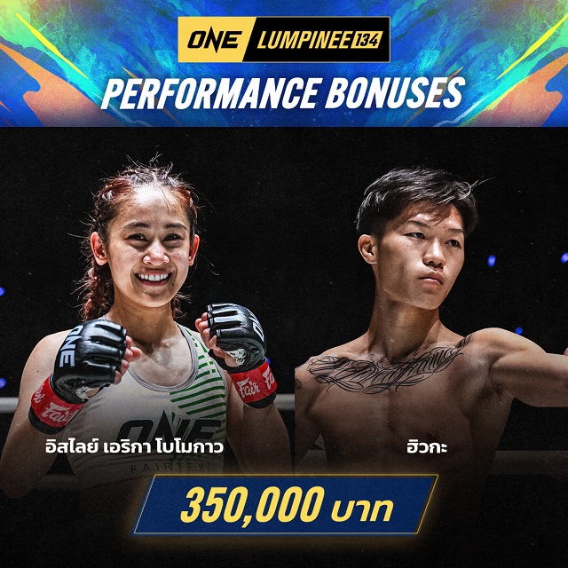 第6試合女子ムエタイ戦ではONE3連勝中のイスライ・エリカ・ボモガオ(フィリピン)がタイ選手にKO勝で4連勝&2連続KOとなりボーナスも獲得。アトム級王者ペッディージャー・ルッカオポーロントン(タイ)のタイトル戦線に食い込むか?(トップ写真)