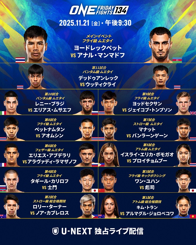 11月21日(金)タイ・バンコクのルンピニースタジアムで開催された『ONEルンピニー/フライデーファイツ134』。メインはラジャ&ルンピニーのムエタイ王座を同時保持し、旧KNOCK OUT王座も獲得したヨードレックペット・オー・アトチャリア(タイ)が強打のアナル・マンマドフに2R接近戦での左横肘と左ストレートで2度のダウンを奪い判定勝ち。