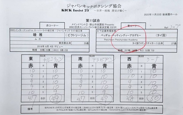 11月23日(日)東京・後楽園ホールで開催されたジャパンキックボクシング協会「KICK Insist 25」。ダブルメインはWMO世界王座決定戦で元ONEキックボクシング・フライ級王者ペッダム・ペッティンディーアカデミー(タイ/トップ写真)、瀧澤博人(日本/ビクトリージム)が王座獲得した。