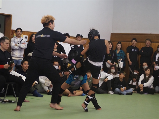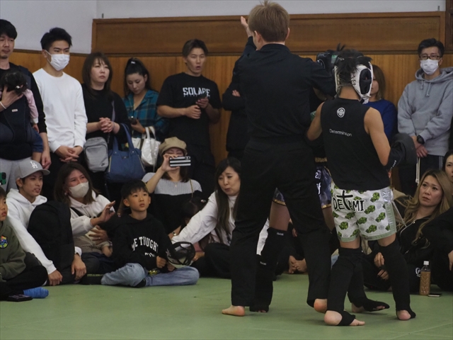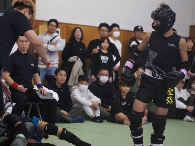 他には40kg以下、辻畑陽気 ( Determination )と月田輝星 ( 心将塾 )の1戦ではワンツーに膝とキレのある技を見せる月田に辻畑は左右のミドルに左フックとヒットを稼いでいき、ラウンド中盤にはカウンターのストレートからのパンチ連打に左ミドルでラッシュを見せるなどインパクトを残す。2Rには月田はワンツーなど真っすぐのパンチで反撃を狙うも辻畑はドンドンとパンチの回転を上げていくとそのままパンチ連打でファーストダウンを奪う。再開後、月田も打ち合いに向かうも辻畑の回転の速さには舌を巻く、ワンツーにフックで辻畑が再びラッシュをかけていったところでレフェリーストップ。2R38秒、圧巻のラッシュを魅せた辻畑がTKO勝利を飾った。また同級、40kgで対戦した福島聖弥 ( NJKF TOP GUN GYM ) vs 上原斗真 ( HAMA・GYM )の1戦では、開始早々から福島がストレートに左ミドル・膝とまくし立てていき早々にダウンを奪う。再開後、上原もガードを固めながらワンツーを軸に返していくも最中で放たれた福島の膝が直撃すると上原はそのまま崩れ落ちレフェリーストップ、1R1分1秒で福島がTKO勝利を果たした。