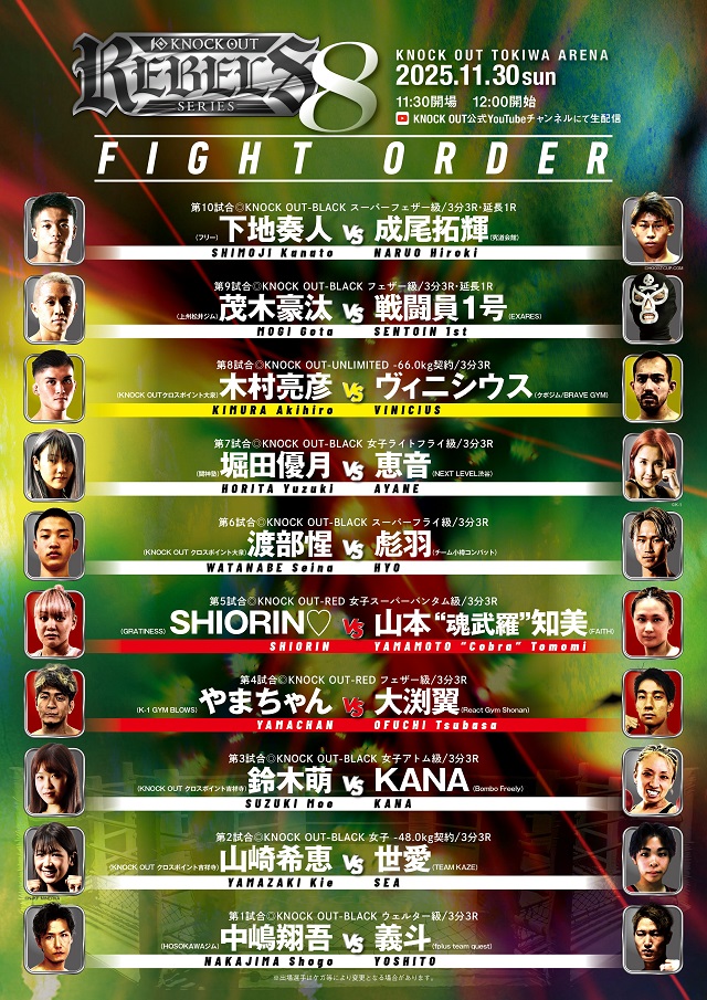 11月30日(日)福島県KNOCK OUT常葉アリーナで開催された「KNOCK OUT REBELS SERIES.8」。旧K-1ルールのBLACK 7試合、オープンフィンガーグローブ着用のONEムエタイルールのREDルール2試合にグランド状態打撃可のUNLIMITED 1試合の全10試合が行われた。