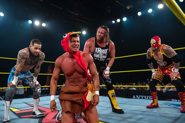 ライアン・ネメス、ブライアン・マイヤーズ、マンス・ワーナー、トレイ・ミゲル、エリック・ヤング、ホームタウン・マンの6人が入り乱れる中、最後はマイヤーズがロスターカット・クローズラインを決めてライアンからフォールを奪った。当然、ライアン・ネメスはコスプレを拒否して、逃げようとするも、マイヤーズ、ミゲルがリング下に逃亡するライアンを捕まえてリングに放り込む。そしてリングで待っていたホームタウン・マンがライアンをKO。気を失ったライアンに三人で七面鳥のコスプレ姿に無理やり着替えさせられてしまった。目を覚ましたライアンは、やけくそになって七面鳥姿でポーズをとったのだった。