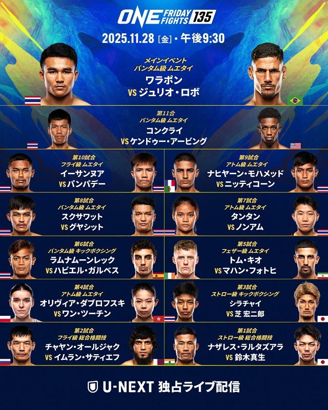 11月28日(金)タイ・バンコクのルンピニースタジアムで開催された『ONEルンピニー/フライデーファイツ135』。メインはONE4連勝1KO中のワラポン・ソー・デチャパン(タイ)にONE負け越しているが、元ルンピニー王者ガオナーをKO(2023年11月24日ONE FF 42)しているジュリオ・ロボが強打を振るい続け、1年10カ月ぶりくらいとなる復帰戦に勝利した。