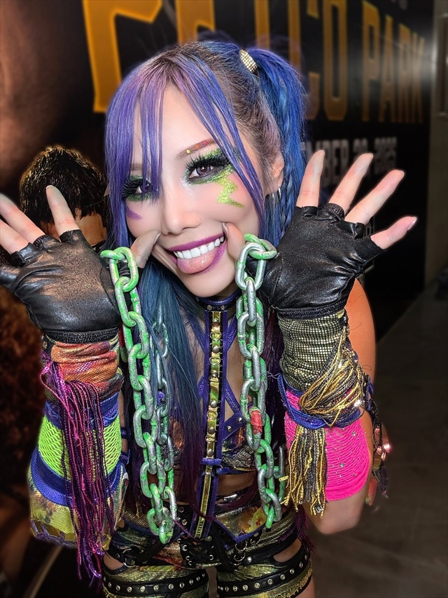 写真では、紫がかった髪をツインテール風にまとめ、チェーン装飾のブラトップやシルバーのショートパンツ、青いファー付きの袖口といった華やかな衣装を着用。控室とみられる背景で舌を軽く出すポーズを見せ、独自の世界観を強調した。いわゆる“パイレーツプリンセス”として知られるスタイルが前面に出たショットとなっている。